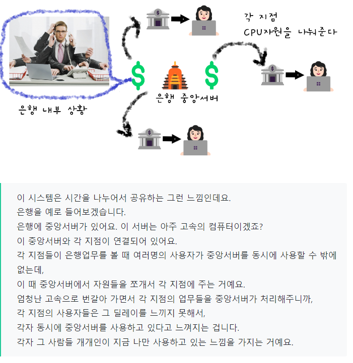 여러 사용자들의 프로그램을 엄청 빠르게 돌아가면서 처리해주니까 그 시간차를 사용자들이 느끼지 못하고 동시에 각자 독립된 컴퓨터를 사용하는 것처럼 느껴지는 것임