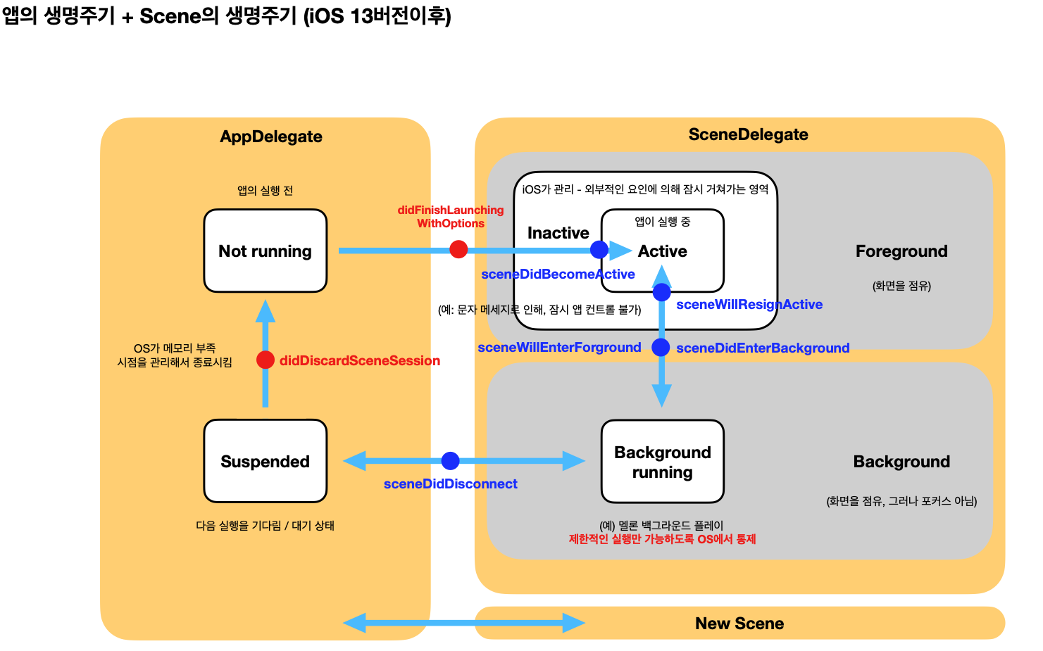 파란색 점이 SceneDelegate.swift에 존재하는 메서드이다 .