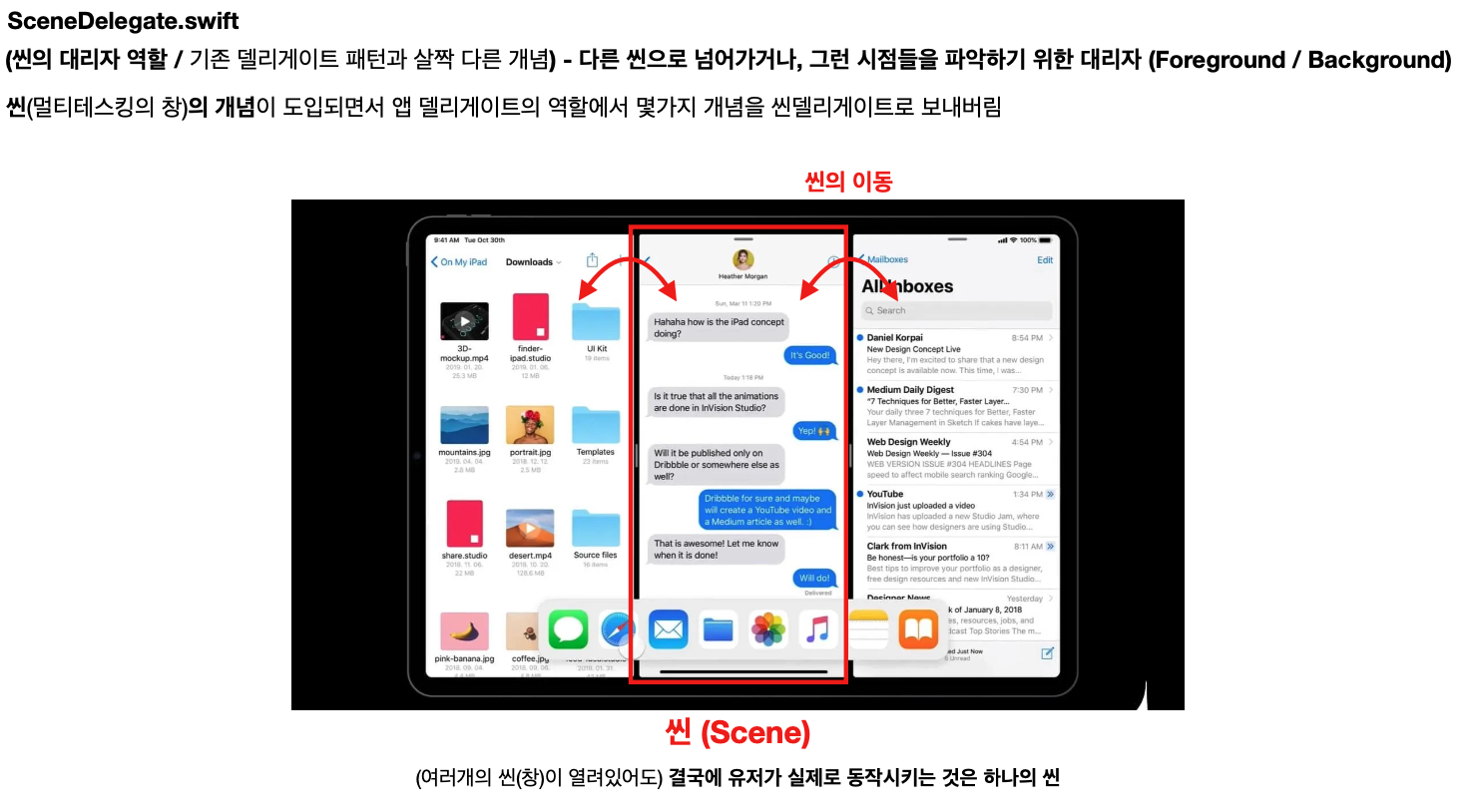 Scene의 전환이 일어나는 Foreground(Inactive, Active) / Background 메서드들이 SceneDelegate.swift 파일에 존재한다.