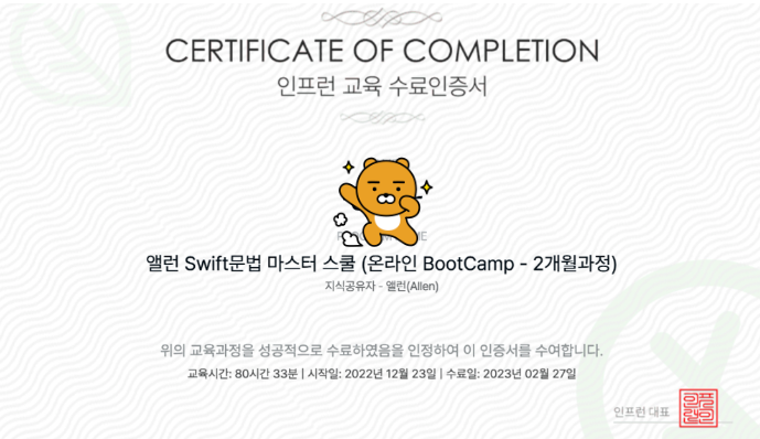 실력을 향상할 수 있었다. 사실 말이 2개월 과정이지 앱 만들기 과정 그리고 복습을 포함하면 5개월 과정인 거 같다.