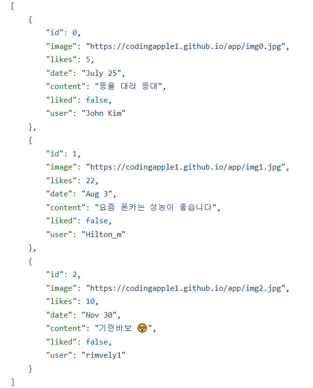 서버가 보내준 인스타그램용 게시물 데이터 3개입니다.